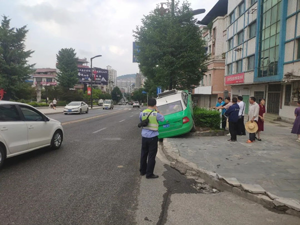 7月8日上午7點30分左右,民警接到報警稱:“在麻江縣同和廣場路段發生一起單方事故,請出警”,民警接警后立即趕到現場。民警到達現場后,發現有一輛綠色出租車停在行駛方向右側,整個車身沖上右側綠化帶內,車頭更是爬上了行道樹的半腰上,整個車頭碰撞行道樹造成隔離帶、行道樹損壞以及車輛嚴重受損的道路交通事故。