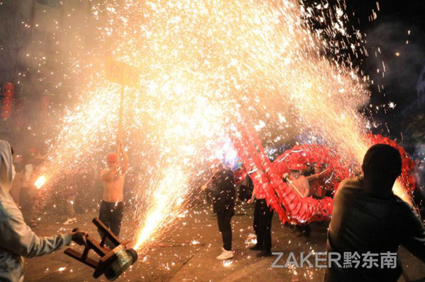 2 月 15 日晚,在臺(tái)江縣城大燈塔現(xiàn)場(chǎng),十幾條巨龍?jiān)谖鑴?dòng)起來(lái),只見(jiàn)舞龍者高喊 " 花來(lái)了、花來(lái)了 ",噓者手持花筒蜂擁而至,點(diǎn)燃自己手上的花筒,發(fā)出 " 呼呼 " 的噴射聲直指龍頭、龍身 . 頓時(shí),火光滔天,猶如波浪,一浪翻過(guò)一浪,舞龍者赤身裸背在火花四射中舉著龍燈前進(jìn),漂亮的禮花炮在上空閃耀,噓花和舞龍?jiān)谧分稹⒈绕矗@險(xiǎn)刺激,壯觀(guān)無(wú)比。