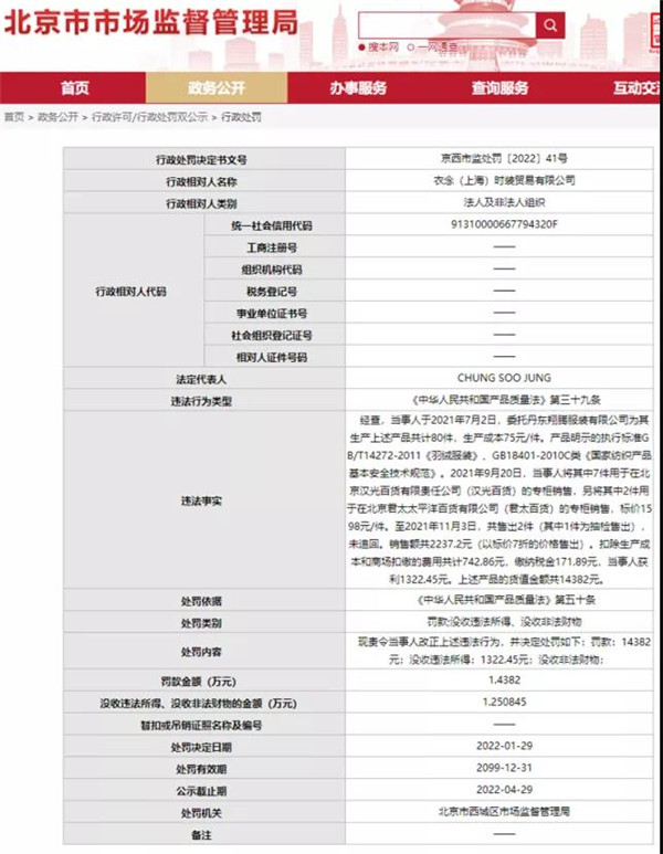 北京市西城區市場監督管理局判定,上述違法行為屬于《中華人民共和國產品質量法》第三十九條,依據《中華人民共和國產品質量法》第五十條,責令當事人改正上述違法行為,并決定處罰如下:罰款:14382元;沒收違法所得:1322.45元;沒收非法財物。