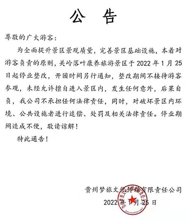 為全面提升景區景觀質量,完善景區基礎設施,本著對游客負責的原則,關嶺落葉康養旅游景區于2022年1月25日起停業整改,開園時間另行通知,整改期間不接待游客參觀,未經允許擅自進入景區內,發生任何意外,后果自負,我公司不承擔任何法律責任,同時,對破壞景區內環境、公共設施者進行追償、處罰及相關法律責任。停業期間造成不便,敬請諒解!