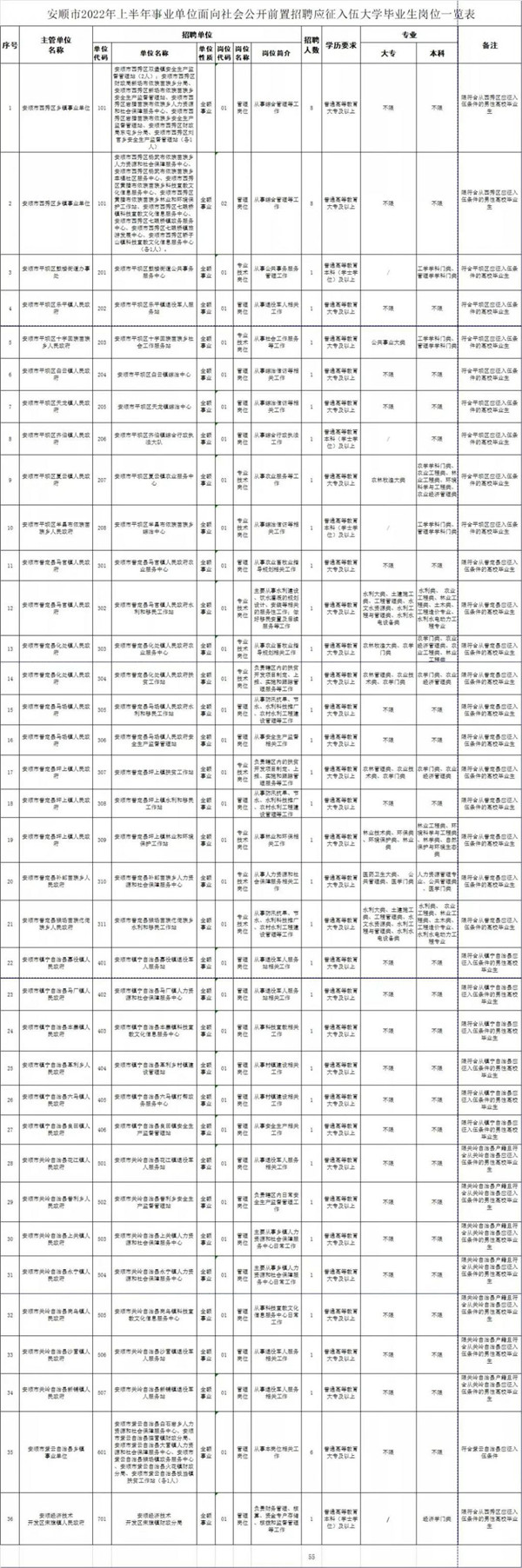 全市計劃公開招聘應征入伍優秀大學畢業生55名。各縣(區)具體招聘崗位及招聘條件詳見《安順市2022年上半年鄉鎮事業單位面向社會公開前置招聘應征入伍大學畢業生崗位一覽表》(以下簡稱《崗位一覽表》附件1)。