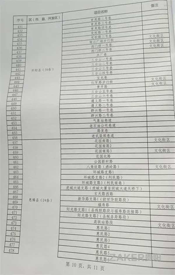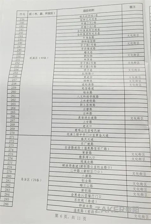 春苑巷(陽光家苑門口)、會展四號路、碧海北路(三境路—楓林路段)、觀梨巷(觀山西路至梨園路)、紅街(翡翠天驕段)、山水巷(雷鋒廣場后U型路)、干道入村組小巷道口、軒宇巷、白龍洞路中段、楓香巷(貴陽市勘察設計院旁)。
