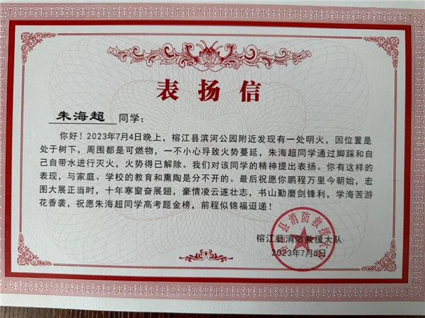 “當時真沒有想太多,只想著不能讓火勢蔓延,不要給他人造成危險。”朱海超同學說到。朱海超同學的熱心腸愛幫忙不僅于此,遇到身邊同學有困難時,他總是第一個跑去幫忙,展現當代青年的責任與擔當。