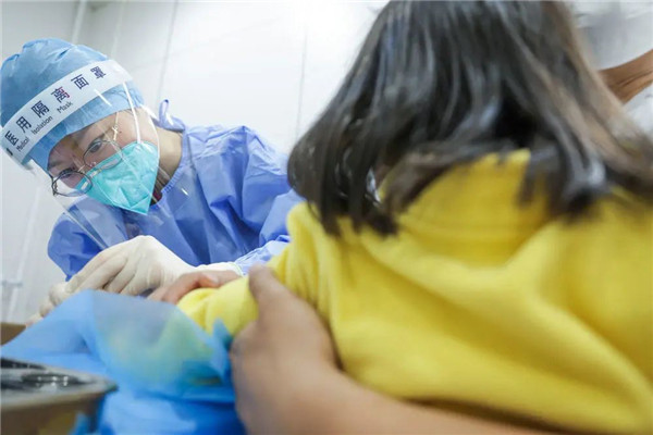 5月9日22時許,北京協和醫院急診科發熱門診護士姜迪為一個兒童采指血。新華社記者張玉薇攝