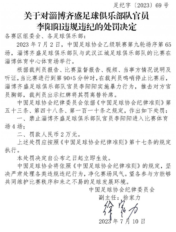 中國足球協會紀律委員會依據相關規定,處罰如下:禁止淄博齊盛足球俱樂部隊官員李陽陽進入比賽體育場4場;罰款人民幣2萬元。