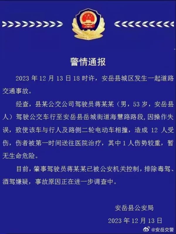 昨日23時許,安岳縣公安局通報稱,12月13日18時許,安岳縣城區(qū)發(fā)生一起道路交通事故。經(jīng)查,縣某公交公司駕駛員蔣某某(男,53歲,安岳縣人)駕駛公交車行至安岳縣岳城街道海慧路路段,因操作失誤,致使該車與行人及路側(cè)二輪電動車相撞,造成12人受傷,傷者被第一時間送往醫(yī)院治療,其中1人傷勢較重,暫無生命危險。