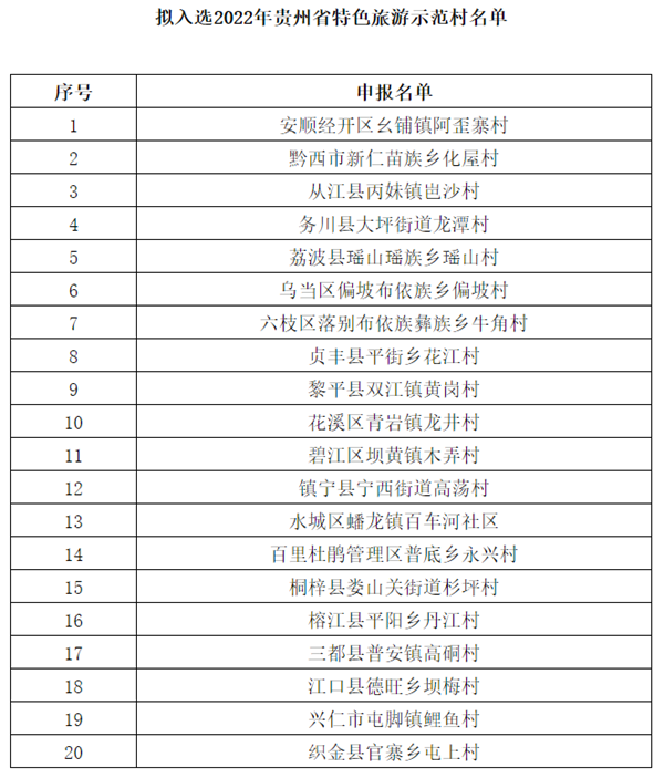 此名單按照貴州省文化和旅游廳《關于開展貴州省特色旅游示范村申報工作的通知》要求,經各地自愿申報,各市(州)文化和旅游部門推薦,貴州省文化和旅游廳組織有關專家進行評定,如對公示對象有異議,可在2023年1月12日—16日,公示期內提出意見。