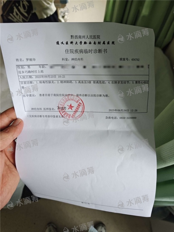 可是天不遂人愿!9月23日那個平常的下午,父親突然倒下了。當我們心急火燎地把他送到黔西南州人民醫院時,他已經陷入了昏迷。醫生的診斷像晴天霹靂:病毒性腦炎并伴有多種并發癥!這個陌生的病名背后,是每天高達數千元的醫療費,是看不到盡頭的ICU病房,是我們這個普通農家根本無力承擔的沉重負擔。