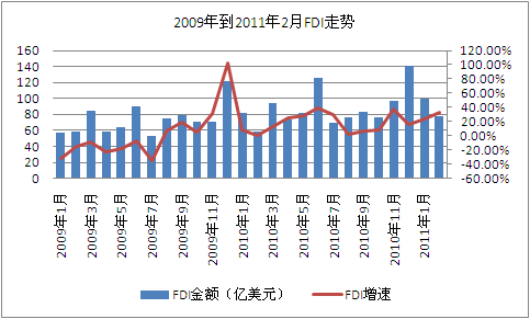 據商務部統計,2011年2月,全國新批設立外商投資企業1156家,同比下降10.9%;實際使用外資78億美元,同比增長32.2%。