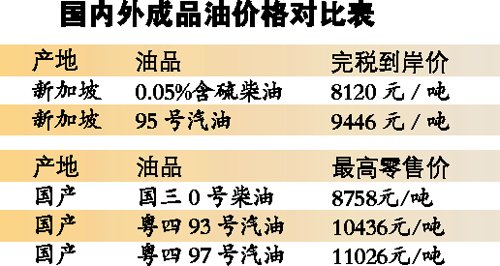 記者昨天了解到,按照發改委對成品油最高銷售價的有關規定,目前廣州93號汽油的最高零售價是10436元/噸,而97號汽油的最高零售價是11026元/噸。即便是參照93號汽油最高零售價,從新加坡進口一噸95號汽油,加上運費和其他費用,完稅到岸價才9446元,理論上的凈利潤空間高達990元;如果參照97號汽油,從新加坡進口一噸汽油的理論利潤高達1580元;而進口一噸新加坡0.05%含硫柴油的利潤,為每噸638元。