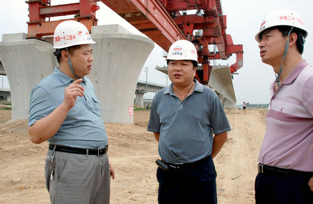 7月的西安熱浪翻滾。下午兩點(diǎn),在大西客專(zhuān)灞河特大橋工地,幾個(gè)人正在橋墩上忙碌著,對(duì)錨栓孔和支撐墊石進(jìn)行最后一遍檢查。他們濕透的襯杉緊貼在后背,汗珠像雨似地不斷往下掉。中間領(lǐng)頭的一位,就是中國(guó)鐵建二十一局集團(tuán)三公司大西第一項(xiàng)目部經(jīng)理雷榮仁。