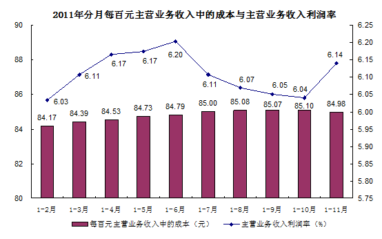 規(guī)模以上工業(yè)企業(yè)實(shí)現(xiàn)主營(yíng)業(yè)務(wù)收入759338億元,同比增長(zhǎng)28.2%。每百元主營(yíng)業(yè)務(wù)收入中的成本為84.98元,主營(yíng)業(yè)務(wù)收入利潤(rùn)率為6.14%。