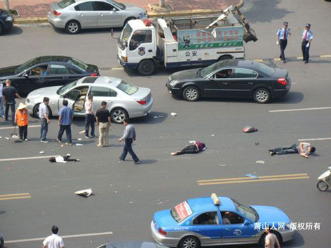 昨天上午11點(diǎn)左右,當(dāng)記者趕到事發(fā)現(xiàn)場(chǎng)時(shí),留在金城路現(xiàn)場(chǎng)的血跡清晰可見(jiàn)。馬路上,圍觀(guān)的人群談?wù)撝?dāng)時(shí)的一幕。一位姓汪的先生說(shuō),受傷最嚴(yán)重的是一個(gè)4歲小女孩,已被好心司機(jī)送往蕭山醫(yī)院搶救,而兩個(gè)被撞的大人,則被送到了蕭山中醫(yī)院救治。
