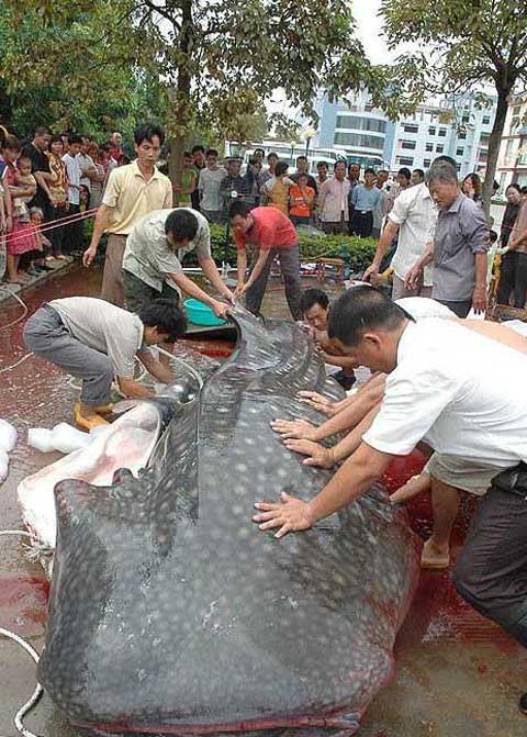 之后,帖子又詳細描述了抓捕食人魚的過程:“警方蹲點數(shù)天,用活雞做誘餌,食人魚饑餓難忍,終于浮出水面。在旁守候的武警見到水中有異樣,向水中開槍,有幾槍正中要害,食人魚在水面不斷掙扎,武警及時撒網(wǎng)收網(wǎng),拖上岸邊。”帖子里還附了好幾張抓獲“食人魚”的照片,并指出:“這條鲇魚長3米多、頭寬1米多!”