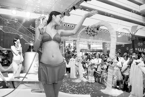 記者來(lái)到這家大酒店,大廳里圍滿了人,三個(gè)八九歲的孩子邊跑邊喊“看洗澡了,看洗澡了。”費(fèi)力擠進(jìn)人群才看到大廳的右側(cè)放了兩個(gè)浴缸和淋浴器,兩名長(zhǎng)頭發(fā)女孩站在浴缸里拿著淋浴器在沖洗,她們僅穿著胸衣和三角褲,擺出各種搔首弄姿的姿勢(shì),不少男性觀眾拿著手機(jī)拍照,還有人擠到樓梯上觀看。