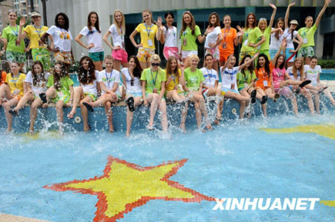 新華網(wǎng)消息 8月13日,參賽選手在南京下關(guān)世茂外灘新城的泳池邊拍攝外景照。當(dāng)日,參加2009世界城市休閑小姐大賽總決賽的各地選手們來(lái)到南京下關(guān)濱江風(fēng)光帶拍攝外景照并參觀游覽。本次世界城市休閑小姐大賽的總決賽將于15日晚在南京舉行。