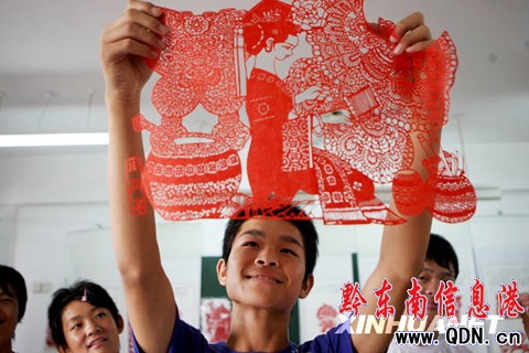 9月7日,安徽省淮北市特殊教育學校的孩子展示為老師制作的剪紙