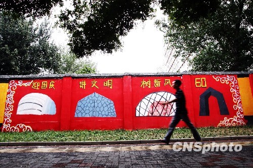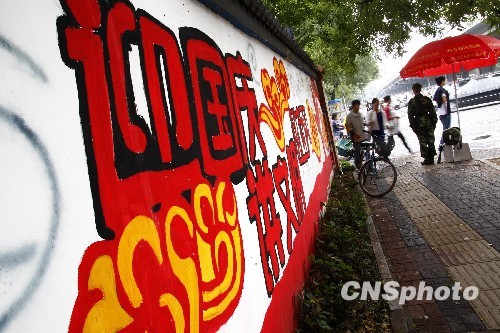 9月26日,北京街頭的“國慶文化墻”涂鴉吸引不少路人的目光。國慶節漸近,北京的大街小巷國慶氣氛日益濃厚。