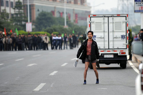 26日,廣東一黎姓男子在原公司索要工傷賠償被拒后,脫掉褲子提殺豬刀砍公司大門。他自稱“沒衣服、沒飯吃,就只能去偷去搶。并不是我不想做好人,是家庭環境、社會現實沒有給我機會。有錢人什么都有,我連煙都沒得抽。與其茍且活著,不如通過這樣來改變命運。”