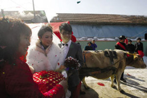 吉林小伙用10輛牛車接新娘 寓意十全十美(圖)
