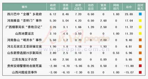 人民網(wǎng)4月12日?qǐng)?bào)道 人民網(wǎng)輿情監(jiān)測(cè)室今天發(fā)布了“2010年第一季度地方應(yīng)對(duì)網(wǎng)絡(luò)輿情能力排行榜”,對(duì)2010年第一季度地方黨政機(jī)關(guān)應(yīng)對(duì)輿情熱點(diǎn)事件的得失進(jìn)行考評(píng)。四川巴中“全裸”鄉(xiāng)政府因?yàn)樵谛畔⑼该鞫取⒄帕Φ戎笜?biāo)上一枝獨(dú)秀,進(jìn)入總體較為得體的藍(lán)色區(qū)域,而貴州安順警察槍擊致死案、山西問(wèn)題疫苗事件則被判定為應(yīng)對(duì)嚴(yán)重失當(dāng),被亮起“紅色警報(bào)”,值得反思。中國(guó)人民大學(xué)公共政策研究院執(zhí)行副院長(zhǎng)毛壽龍教授在點(diǎn)評(píng)山西疫苗事件時(shí)就指出“問(wèn)題一個(gè)系統(tǒng)又一個(gè)系統(tǒng)的出,再一個(gè)系統(tǒng)一個(gè)系統(tǒng)地去治理,顯然不是一個(gè)好辦法。所以,現(xiàn)在是各個(gè)領(lǐng)域都需要很好重視的時(shí)候了”。