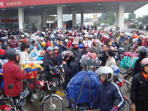 春節(jié)臨近,由佛山、東莞、廣州等珠三角城市返鄉(xiāng)農民工組成的10萬“摩托車返鄉(xiāng)大軍”,沿著321國道回老家過年。為了確保他們能夠順利返鄉(xiāng),廣東省2萬多交警上街,疏導指揮,在雨霧等惡劣天氣還專門用警車為“摩騎大軍”開路,沿途護送,同時還在路上設置專門休息點。