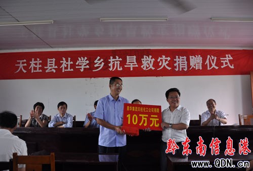 本港訊 (特約記者 楊仁海 攝影報道)8月11日,在天柱縣社學鄉舉行的抗旱救災捐贈儀式上,中國昊華化工集團天柱化工有限責任公司向該鄉捐贈10萬元,支持當地抗旱救災工作,深受社會各界一致好評。