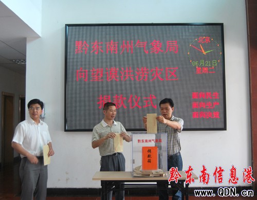 “6.06”望謨特大暴雨洪澇災(zāi)害發(fā)生后,黔東南州氣象局迅速響應(yīng)省委及州委《關(guān)于組織向望謨縣等洪澇災(zāi)區(qū)開展捐贈活動的緊急通知》,于6月21日上午組織全體干部職工舉行了“向望謨洪勞災(zāi)區(qū)捐款儀式”,號召全局干部職工發(fā)揚中華民族“一方有難、八方支援”的傳統(tǒng)美德,向承受災(zāi)難的災(zāi)區(qū)人民送上溫暖和愛心,職工們紛紛積極踴躍的將自己的愛心用信封裝載著投到了捐款箱里,僅不到一個小時的時間,就捐款4000余元,職工們紛紛表示,最近經(jīng)常從電視和網(wǎng)絡(luò)上看到望謨洪災(zāi)的圖片報道,觸目驚心之余更感覺到大自然的威力,作為一名氣象人,責(zé)無旁貸的去捕捉風(fēng)云變幻的信息后,輔助為一些氣象災(zāi)害帶來損失的災(zāi)區(qū)做好災(zāi)后重建,是我們氣象服務(wù)的后續(xù)工作,正所謂體現(xiàn)了氣象人“以人為本”的服務(wù)理念。目前,捐款活動還在進行當(dāng)中。