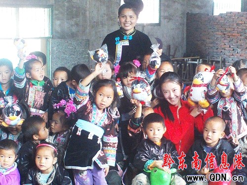 九龍村幼兒園小朋友舉著捐贈禮品和騰訊公司游戲玩家代表盈盈小姐合影現(xiàn)場