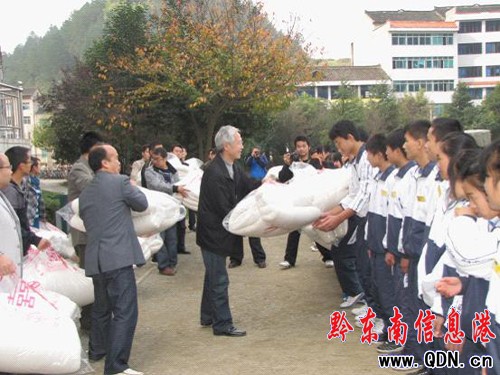 冬季來臨,我校領導在檢查學生寢室的過程中,發現一部分住校生的鋪蓋特別單薄,只有一張席子和一件薄被,甚至兩人共用一件被子。學校領導看在眼里,急在心頭,通過向班主任了解和選派老師進村入戶實地調查,發現這些學生都是家庭經濟貧困的農村學生。為使學生安全過冬,安心學習,學校領導積極向政府和社會各界設法解決貧困學生的御寒被蓋問題。愛心人士李順驊先生聽了我校領導反映的困難后積極幫助聯系,深圳市瑞和建筑裝飾股份有限公司老總李介平先生急人所急,慷慨解囊,熱心奉獻,捐助10萬元為雷山民族中學貧困學子解決過冬棉被。