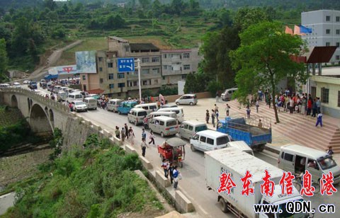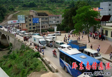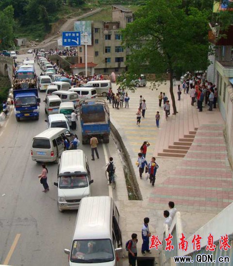 圖為:2009年5月15日,一些非法營運面包車在黃平縣重安鎮中學校門前拉客的堵車現場。