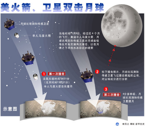 美航天局發(fā)表新聞公報(bào)說,半人馬座火箭、月球坑觀測(cè)和傳感衛(wèi)星10月9日相繼撞擊了月球南極附近的凱布斯坑,重約2.2噸的半人馬座火箭撞月后激起了兩部分塵埃:一部分由蒸汽和微塵組成;另一部分由質(zhì)量更重的物質(zhì)組成。月球坑觀測(cè)和傳感衛(wèi)星攜帶的光譜儀對(duì)塵埃進(jìn)行了分析。
