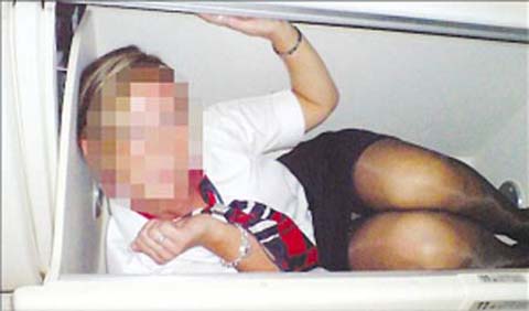 據(jù)報(bào)道,這些艷照顯然是英國航空公司的幾名空姐在飛機(jī)航班上工作之余抽空拍下來的,照片上的這些空姐大多穿著英國航空公司的空姐專門制服,有的胸前還掛著工作牌。這些曝光的艷照顯示,有的空姐對著攝像鏡頭撩起了她們的藍(lán)色裙子,故意露出她們穿著長絲襪的性感大腿和赤裸臀部;有的空姐手拿拖把擺出打掃衛(wèi)生的姿勢,可她們卻故意將身前的裙子撩到大腿根部,擺出“性感清潔工”的造型;還有的空姐蜷縮著躺在狹小的手提箱櫥柜中,故意充滿誘惑地露出內(nèi)褲的顏色。