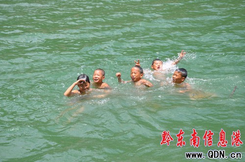 炎炎夏日,氣溫居高不下,連日來火辣的陽光烤得人身上熾熱。日前,記者陪同相關部門從劍河縣柳川碼頭乘船往南加檢查工作,在仰阿莎湖沿岸部分村寨的河里,一些十一二歲的孩子,背著父母到河里嬉戲玩耍,有的還從兩米多高的客渡船頂篷上跳進河里玩“高臺跳水”,很容易發生危險。提醒家長們引起重視,以防不測。(石慶偉 攝)