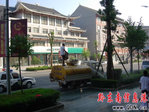 劍河縣為打造山水園林旅游縣城,今年投入270萬元對(duì)縣城主干道兩旁新栽種300多棵胸徑在35厘米,7.5米高的香樟樹。持續(xù)久旱無雨,為確保新栽種的香樟樹成活,該縣動(dòng)用消防車及綠化澆水專用車堅(jiān)持早、晚巡回為300多棵香樟樹澆水解“渴”。(石慶偉)