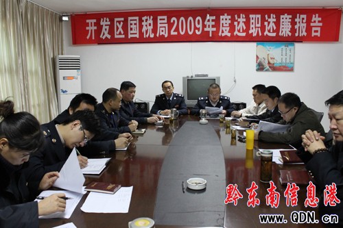 1月19日,開發區國稅局召開2009年度述職述廉報告會,在會上同時進行了廉政考核測評。圖為會議現場。