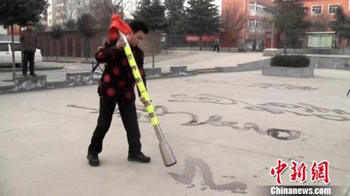中新網(wǎng)訊 用自制一人高的巨型瓶筆,在地面上書寫10平米見方的大字,近日河南洛陽(yáng)47歲書法奇人李一浩創(chuàng)新的書法形式,讓很多觀看的市民驚嘆不已。