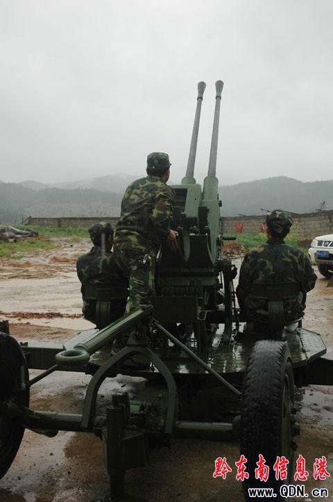 圖為黎平縣民兵預備役戰士正在向天空發射增雨彈的情形