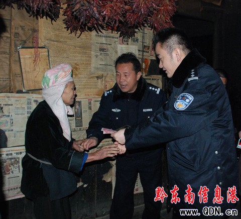 本港訊 (特約記者 唐光新 攝影報道)為貫徹落實以“走千家、進萬戶、訪平安、促和諧”為主題的“大走訪”愛民實踐活動,1月22日上午,雷山縣政府黨組成員、縣公安局黨委書記、局長巫貴生冒著凍雨天氣,帶頭深入基層群眾,來到平祥村進行走訪。在平祥村,巫局長對治安積極分子岑光榮、抗美援朝老戰士的遺霜羅曰里二戶進行慰問,并送上慰問金和食用油,給他們送去組織的關懷和溫暖。圖為巫貴生局長(右一)給抗美援朝老戰士的遺霜羅曰里慰問金的情景。