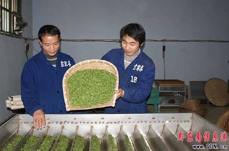 在苗家春茶加工廠,一股股清香的綠茶撲鼻而來,10多名工人正在緊張有序地篩選、轟烤、包裝新茶,銷售處的余敏手機響個停,都是來定購新茶。“一芽茶一公斤1660元,而且貨很緊,一天只能銷售30多公斤,其他級別的茶每天銷售80公斤左右。”余小姐樂呵呵地說。