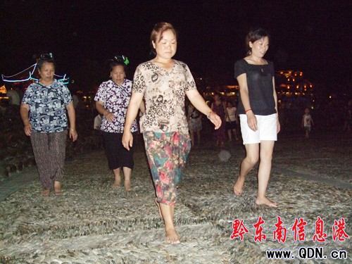 為了消除高血壓隱患,確保身體健康長壽,自夏季以來,雷山縣開展赤腳穴位按摩活動,每天晚上來自縣城退休干部、居民的上千名中老年人在縣城民族文化木鼓廣場參加了赤腳穴位按摩活動。圖為8月15日在民族木鼓廣場中心(蘆笙場)赤腳穴位按摩的場面。(張希才)