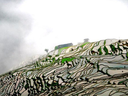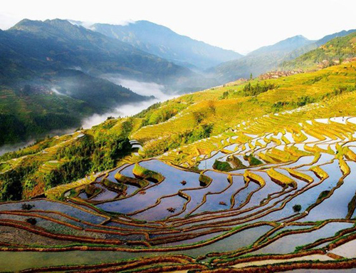 加榜鄉每年的三月初至四月中旬的農耕時節,梯田里泛著銀色的光芒,加車河谷升起的濃霧彌漫在整個山谷,如詩如畫。而到了金秋九月,梯田里金色的麥浪滾滾,美不勝收。