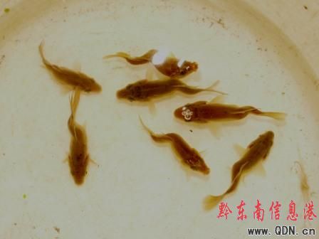 6月23日拍攝的尾鰭部彎曲的7只小鯉魚。當(dāng)日,黔東南州麻江縣碧波鄉(xiāng)石板村一村民,從自家飼養(yǎng)魚苗的魚塘中撈出一指寬大小的數(shù)百尾鯉魚苗準(zhǔn)備出售時,驚奇地發(fā)現(xiàn)其中有7條鯉魚苗尾鰭部與眾不同,彎曲成“S”形。據(jù)黔東南州科協(xié)一位人土判斷,這些鯉魚尾鰭部彎曲可能是其遺傳基因變異或因其生長的水域水質(zhì)污染所導(dǎo)致。 (姜澤鵬 攝)
