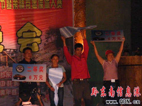 本港訊 (記者 楊驥 攝影報道)8月10日,2009年貴州--黃平且蘭旅游文化節暨親情競速漂流大賽閉幕式在浪洞森林溫泉公園舉行,組委會黃平縣委、縣人民政府為漂流大賽獲獎選手頒獎。