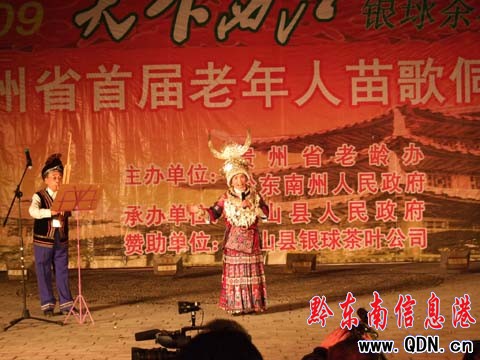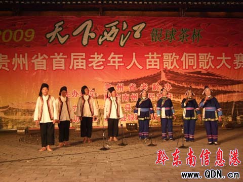 本港訊 (特約記者 張希才 記者 楊輝)10月14日晚上8點, 2009天下西江·貴州省首屆老年人銀球茶杯苗歌侗歌大賽在西江正式開幕,來自我州凱里、黎平、從江、榕江等14個縣市、開發區、州老年大學,黔西南貞豐、安順關嶺、銅仁地區的印江、松桃、玉屏21個代表團、隊356名60歲以上老人開始了比賽。據了解,本次比賽活動年齡最大的有81歲。