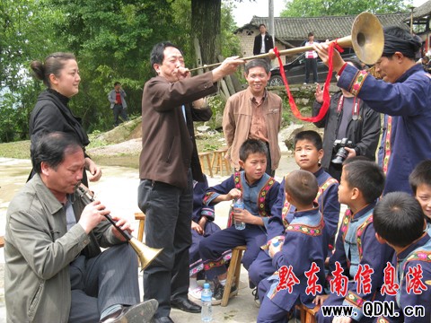 調(diào)研組一行,在該鄉(xiāng)黨委書記楊麗春及其黨政班子成員的帶領(lǐng)和群眾熱情的接待下,深入蜂桶巖組調(diào)研嗩吶文化。粟主席一行剛到蜂桶巖來不及休息,立刻被嗩吶聲聲所吸引。現(xiàn)場,嗩吶班的學(xué)生在老師的帶領(lǐng)下,擺出各種姿勢吹奏嗩吶,民間嗩吶藝人為客人吹奏出各式各樣的曲調(diào),粟主席及其成員不時(shí)用手中的相機(jī)拍下精彩的鏡頭。在農(nóng)戶院子里,嗩吶藝人詳細(xì)介紹了嗩吶文化,并擺上八仙桌,還嗩吶原型。并與深諳嗩吶吹奏技巧的盤壽瑩主任一起,加入到嗩吶吹奏隊(duì)伍中去,吹奏大小嗩吶,擊打金拔,現(xiàn)場氣氛其樂融融。