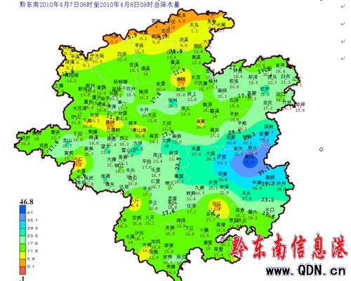 通過此次人工增雨作業(yè),我州共有184個鄉(xiāng)鎮(zhèn)出現(xiàn)降雨,其中171個鄉(xiāng)鎮(zhèn)雨量大于10mm,23個鄉(xiāng)鎮(zhèn)雨量大于25mm,較大降水出現(xiàn)在州東部地區(qū),黎平高屯46.8mm最大,使得旱情的到一定緩解。