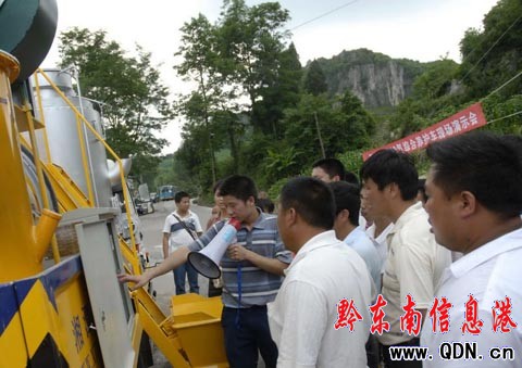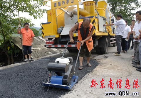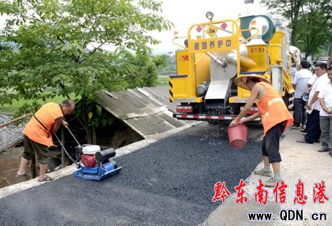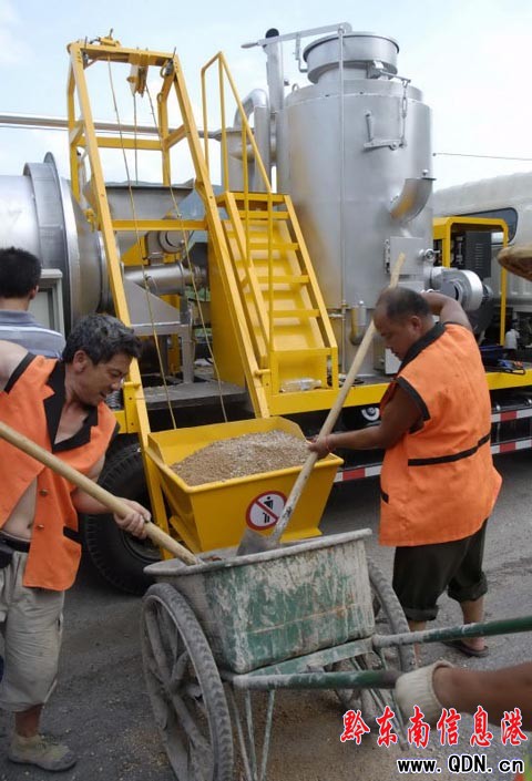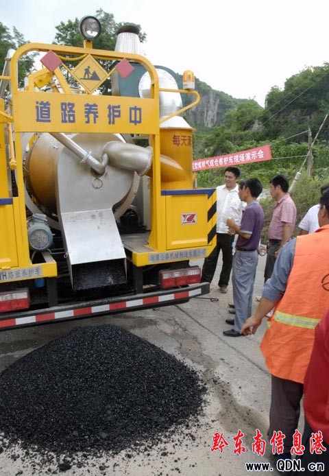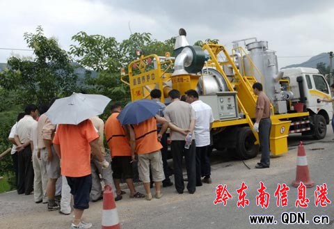 本港訊 (特約記者 陳沛亮)2009年6月19日,首臺國產節能、環保的智能型煤轉氣節能路面養護車在凱里公路管理段投入使用,據了解,該養護車通過煤炭轉換成煤氣后,在實際作業中可節約煤炭、柴油等能原達75%,減輕公路養護工人勞動強度,并降低對環境的污染,適宜公路維修養護作業。 圖為當日,凱里公路管理段公路養護工人在智能型煤轉氣節能路面養護車前作業。該設備是由湖南湘潭公路機械制造有限公司制造的。