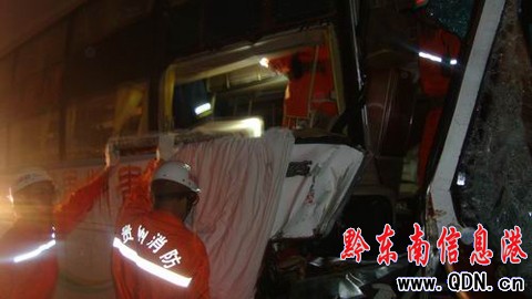 本港訊 (陳智偉 特約記者 張正特)7月5凌晨04 時40分,劍河消防中隊值班室接到110指揮中心稱,玉凱高速公路104公里處(劍河路段)發生交通事故,一輛大型客車與一輛大貨車發生追尾事故,車內有13名人員被困,情況十分危急。接到報警后,大隊值班領導榮鳳濤教導員立即帶領11 名干戰,出動2輛車(指揮車1輛、特勤車1輛)趕赴事故現場。