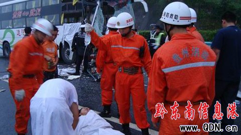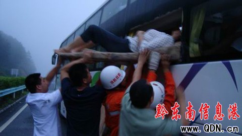 命令下達后,救援工作迅速展開。參戰官兵首先將小孩轉移出事故車。隨后,指揮員命令戰斗班班長陳洋同志進入客車內,詢問傷者的傷勢,找尋適當位置將玻璃窗破開,并利用客車內的床墊將傷者從窗口救出;外面戰士接應從窗口救出的傷者;同時,安排2名戰士照顧其他兩名傷者,穩定其情緒。經過內外合力救助,終于將客車內13名被困人員救出。